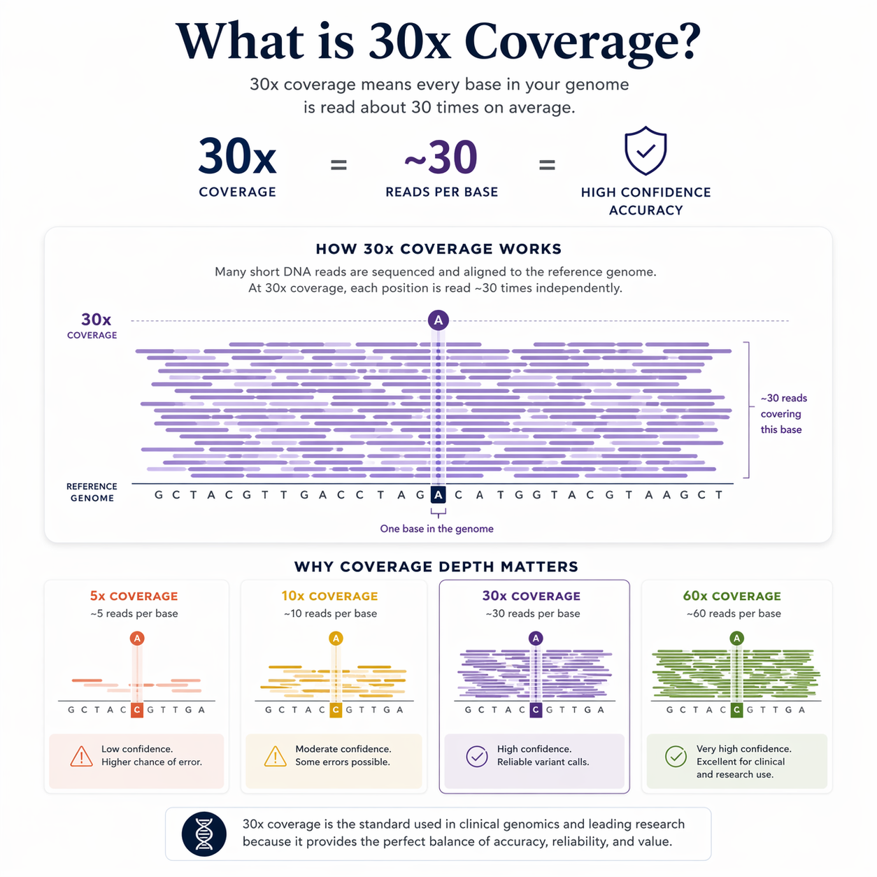Coverage depth is how many times each position in the genome is independently read during sequencing. At 30x, every base pair has been read approximately 30 times.