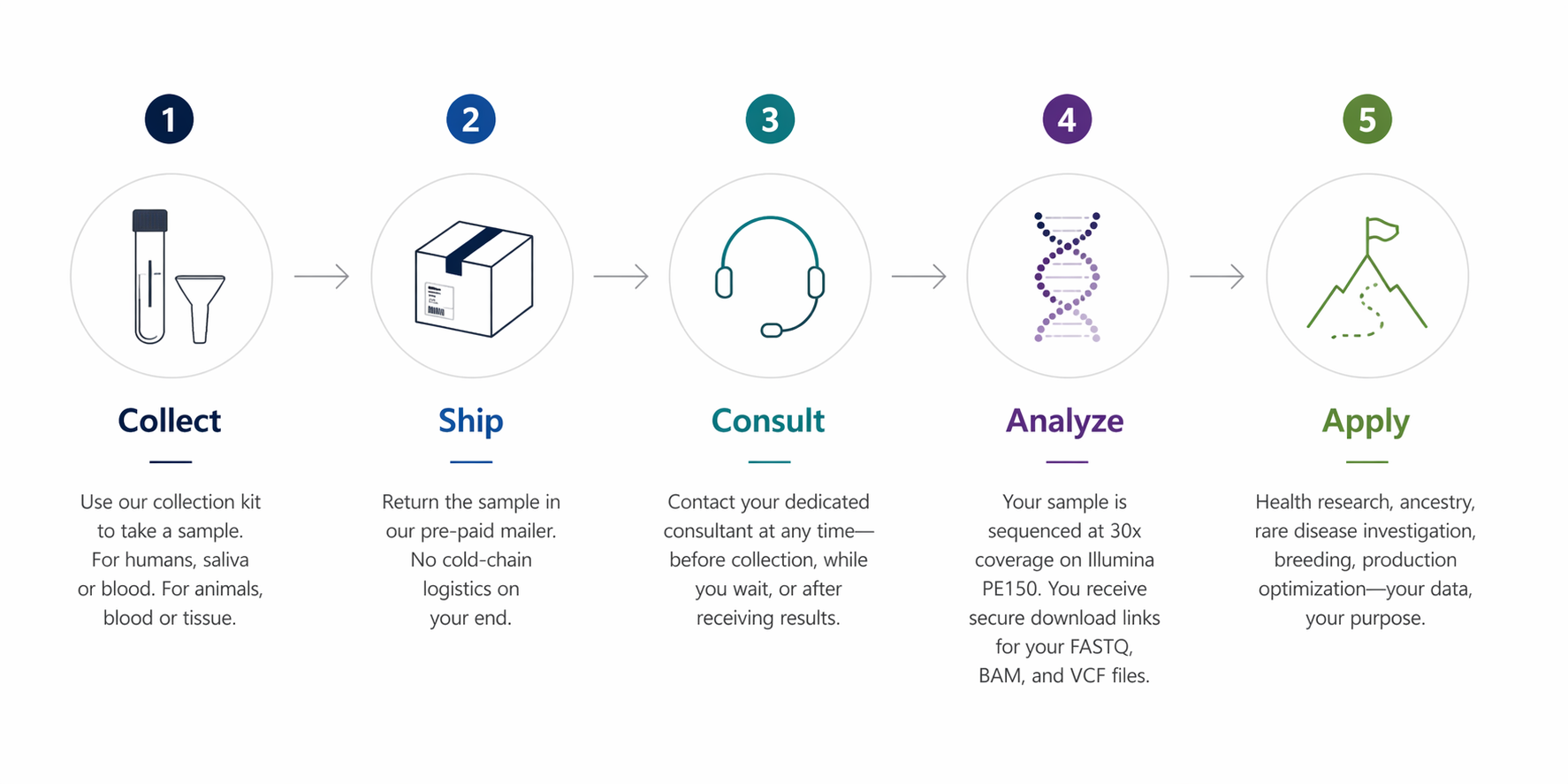 For researchers: Generate publication-quality WGS data for population genetics, comparative genomics, variant discovery, or association studies. The FASTQ, BAM, and VCF files slot directly into standard research pipelines.